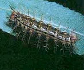 These Caterpillars have several long branched spines protruding from every segment of their body. Initially the caterpillars are colourless. Later they become brown with black dorso-lateral stripes. The final instar is green, with a black, yellow and white head. Overseas, the caterpillars feed on :