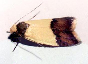 The adult moths are small, reaching only a span of 1.5 cms. They have striking yellow forewings with brown wingtips. The hindwings are brown. The head is yellow and the thorax brown.