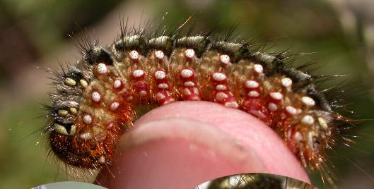 These caterpillars are black with pale brown sides, a lot of black bristles along the back, and four or five round red-edged white warts on the side of each segment.