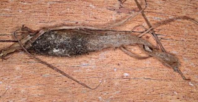 The pupa is brown and tubby.