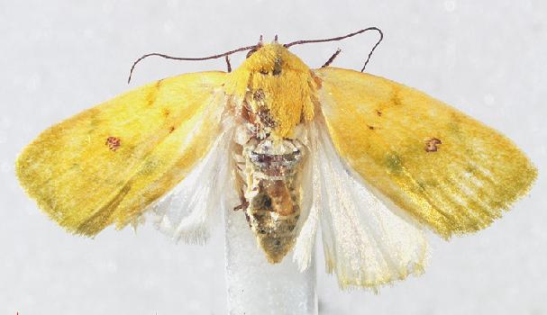 The adult moths of this species are yellow with a rusty brown spot in the middle of each forewing. The wingspan is about 1.5 cms.