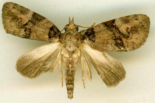 The adult moth of this species has forewings that are grey-brown, each with variable dark markings including a vaguely double dark band across the middle. The hindwings are white shading to brown at the edges. The wingspan is about 2 cms.