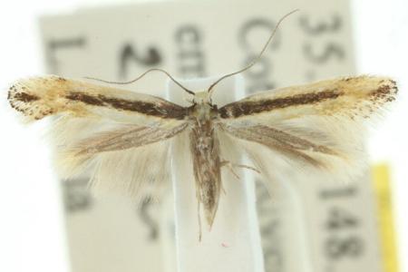 The male moths have white and yellow forewings, each with an interrupted dark brown stripe from the base to the margin. The hindwings are grey, each with a white mark near the tornus, and with long brown and grey fringes along the hind margin. The male moths have a wingspan of about 1 cm.