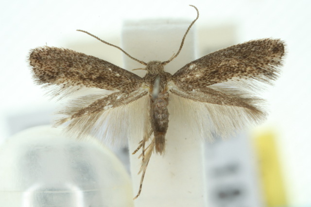 The adult moths have speckled brown wings, with two vague pale areas near the middle of each forewing. The females sometimes have a white spot near the tip of each forewing. The moths have a wingspan of about 8 mms.