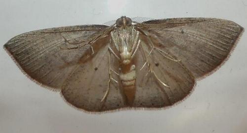 The adult moths are mottled brown all over, each wing having two faint dark transverse lines, and a variable pair of spots near the middle of the margin. The males have a small transparent spot on each forewing. The wingspan is about 2 cms.