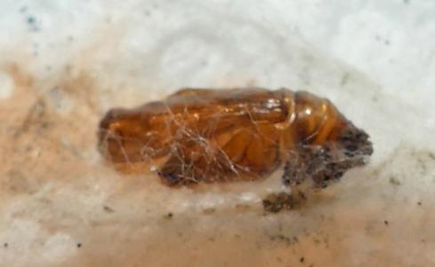 The pupa is brown with greenish areas over the developing wings, formed in a sparse white cocoon in ground debris.