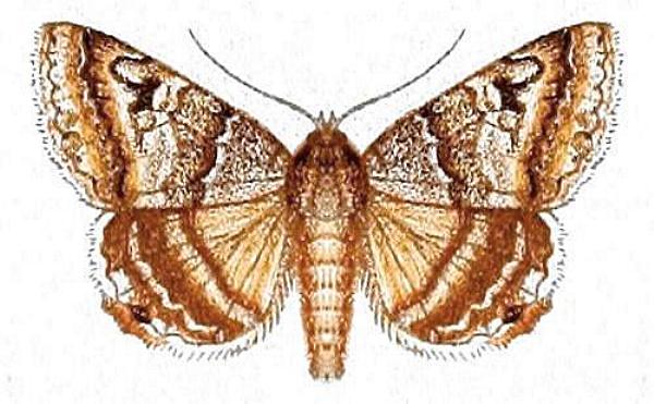 The adult moth is brown, mottled with sinuous markings. The wingspan is about 3 cms.