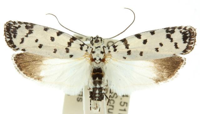 The adult moths of this species have white forewings, each with a pattern of black spots, and white hindwings with grey wing-tips. The head is white, with a narrow black collar. The thorax is white, with black spots. The abdomen is black, with white on the back of each segment. The wingspan is about 3 cms.