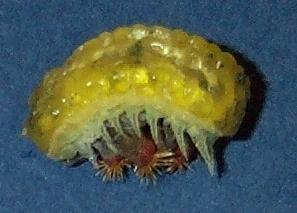 upside down Caterpillar showing no prolegs at all of Doratifera vulnerans, LIMACODIDAE |