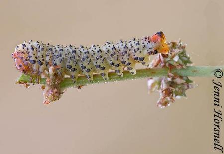 full set of 3 pairs of true legs but with 7 pairs of prolegs :- Larva of a Sawfly, HYMENOPTERA (not a true caterpillar) Photo: courtesy of Jenni Horsnell, Wagga Wagga |
