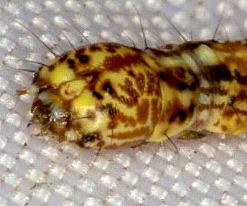 When ready to pupate, the caterpillar attaches itself to a leaf or its shelterby a cremaster. The pupa projects from the leaf, unprotected by a cocoon. The adult emerges after about two weeks.