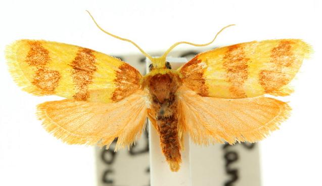 The adult moth of this species has forewings which are orange-brown, each crossed by two broad ragged yellow bands, and with a narrow yellow band along the margin. The hindwings are orange shading darker at the wingtips. The wingspan is about 2 cms.
