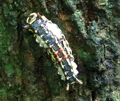 They pupate in crevices of the bark of the food tree in stiff white cocoons.