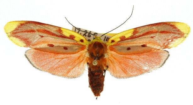 The adult moth has red forewings with dark veins, and with yellow markings along the costa, and at the wingtip and tornus. The hindwings are plain scarlet. The abdomen is also scarlet. The males are rather paler than the females. The wingspan is about 4 cms.