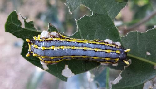 The Caterpillars of this species have built in balloons. There are two large white patches on each side of the body, and when the caterpillar is disturbed, these are inflated. It also then exudes a very sticky substance. Otherwise the animals are grey with two tubercles on the back of each segment.