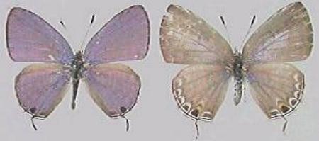 The male adult butterflies of this species are lilac on top, whereas the females are brown. Both have a little tail at the tornus of each hind wing. The males have one or two black spots beside each tail. The females have a whole arc of black spots along the margin of each hind wing.