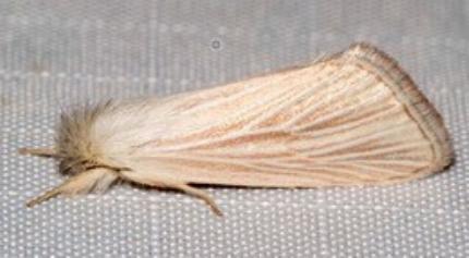 The adult moth of this species has pale brown forewings, each with two white streaks from base to margin. The hindwings are white. The wingspan is about 2 cms.