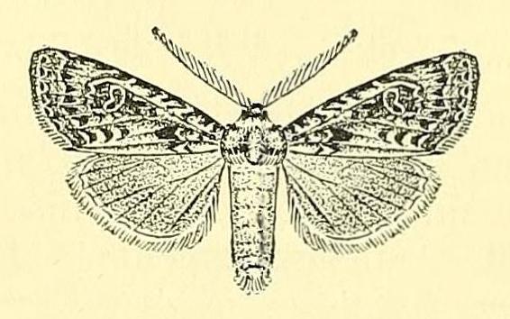 The adult moth of this species has grey-brown patterned forewings including a kidney-shaped mark near the middle of each forewing. The hindwings are buff coloured, with dark veins. The wingspan is about 3 cms.