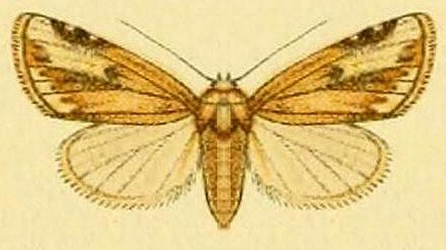 The adult moth has brown forewings each with two pale streaks. The hindwings are off-white, with dark veins. The wingspan is about 3 cms.
