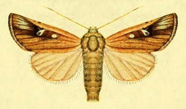 The adult moth has rusty brown forewings with a dark triangle, running from the middle of each forewing to the wingtip, containing pale spots. The hind wings are buff coloured, with dark veins. The wingspan is about 3 cms.
