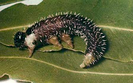 These are not true Caterpillars, but are the larvae of a wasp, or more accurately a Symphytan. When young, these larvae are so gregarious they are often found in a knotted ball of many individuals. When disturbed, they all wriggle their tails and exude a nasty yellowish fluid from their mouths. This latter habit has given them the common name of "Spitfires", although they do not actually spit the fluid, just dribble it. They use the tapping of their tails to communicate with each other.