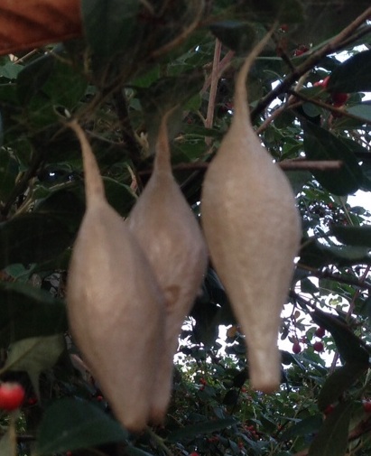 These are like soft spindly cocoons with a length, tip to tip, of about 8 cms. They usually hang in groups of 3 to 5 under trees. Actually they are the egg sacs of one species of spider: Ordgarius magnificus.