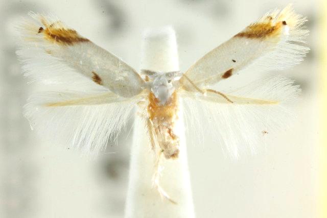 This moth has off-white forewings, each with a brown mark near the middle of the hindmargin. The forewing tips are brownish, each with a prominent black dot. The hindwings are white. The moth has a wingspan of about 0.7 cm.