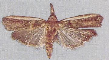 The adult moth has brown forewings with a pale yellow line along the costa and a transverse orange band. The hindwings are pale brown. The wingspan is about 2 cms