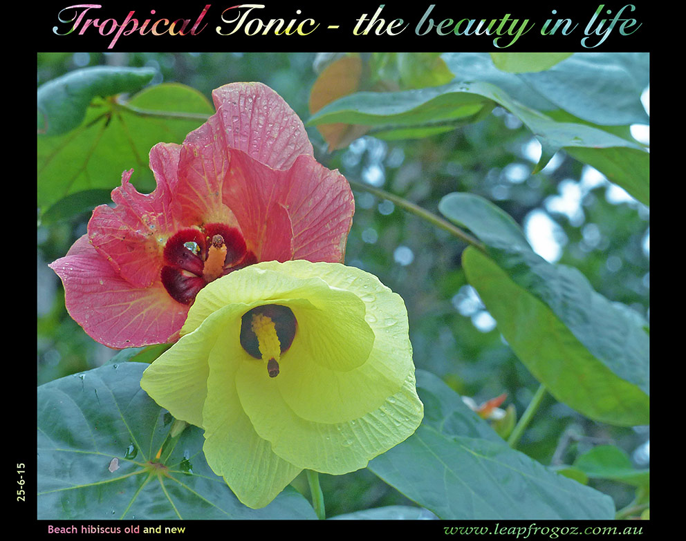 This shrub grows to a height of about 8 metres. It is grown over much of Queensland, Australia. The plant has smooth heart-shaped leaves, each with a length up to about 9 cms. The flowers are yellow with a dark brown interior, appearing in early summer. They have a diameter of about 9 cms.