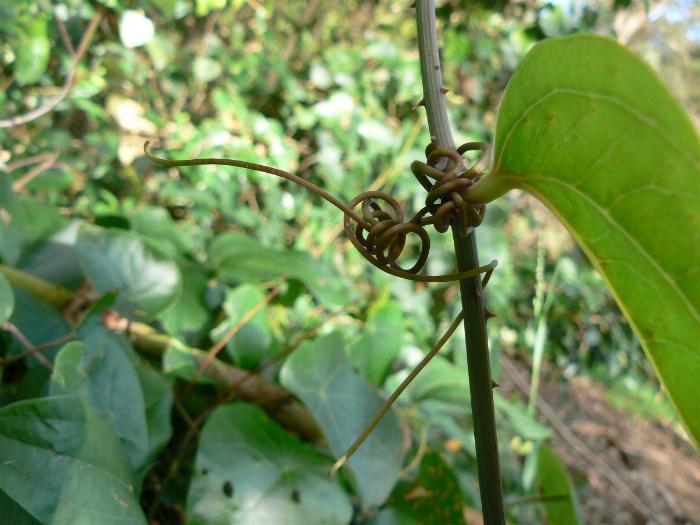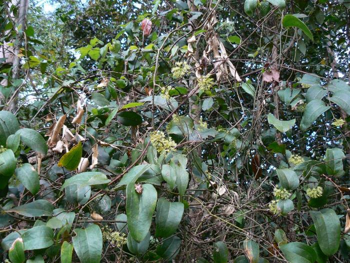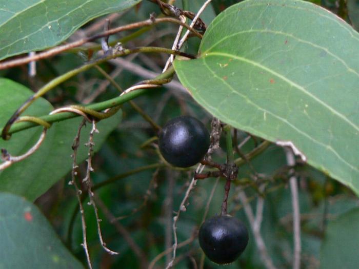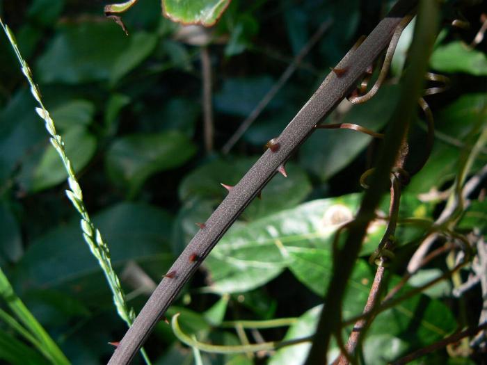 Those sharp thorns, with the aid of paired tendrils growing from the leaf nodes, enables S. australis to thread through bushes and scramble over shrubs and trees, sometimes making impenetrable thickets in the bush.