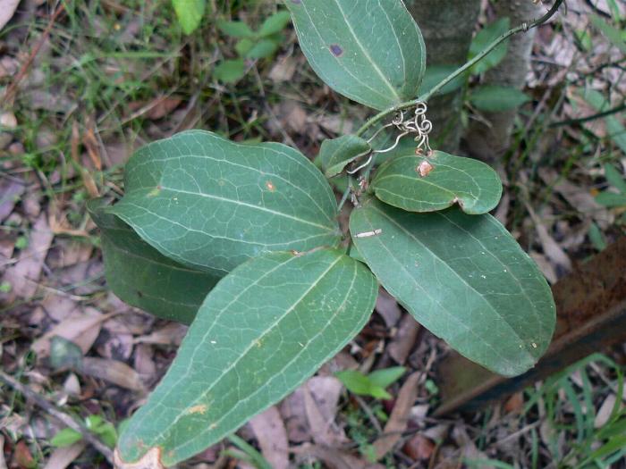 There is a very similar plant called Smilax glyciphylla which is not as robust, has narrower leaves, only three longitudinal veins and no prickles. Sometimes they occur in the same area, even growing together. The whole plant is much smaller; smaller leaves, smaller flowers, but it is said to have sweet tasting berries and leaves which can be eaten when young and tender.