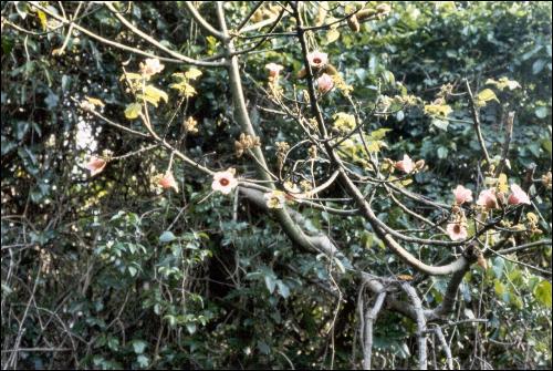 This is a deciduous tree, growing up to 20 metres high. It has 5-lobed leaves, up to 18 cm long. It flowers in summer, when tree is almost leafless. Flowers are pink to red, 6 cm long, with no petals, but sepals are petaloid and coloured, and pubescent on the outside.