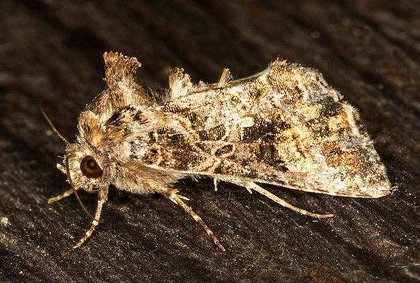The adult moth is predominently grey or brown in colour, with dark brown patches and white markings including a white spot near the middle of each forewing. The hindwings are a uniform brown. There are bunched hairs on the thorax.