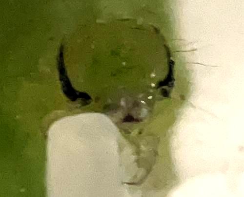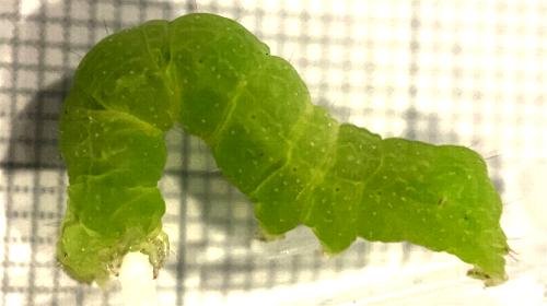 The six true-legs under the thorax appear to be transparent. The caterpillar is missing the first two pairs of prolegs, so walks in a looper fashion.