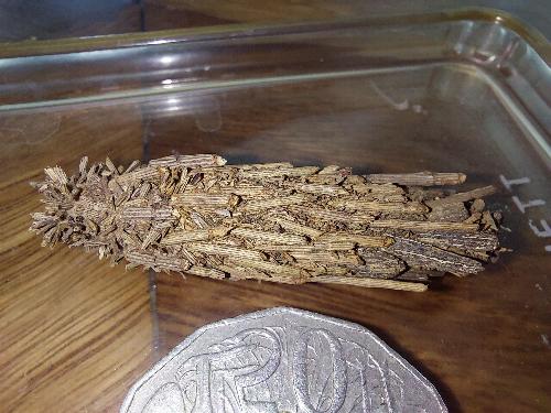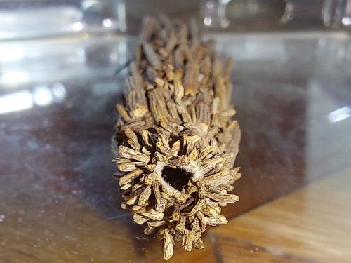 This Caterpillar has a cylinrical case which it covers with detritis. with short sticks also attached all over the case.
