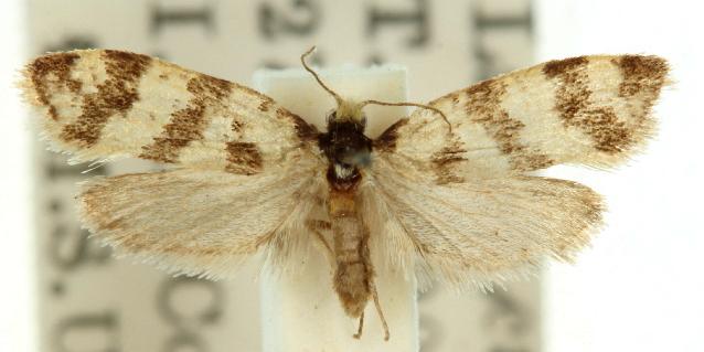 The adult moths of this species have purplish dark-brown forewings, each with four pale yellow transverse bands. The hindwings are grey-brown. The head is yellow and the thorax dark brown. The wingspan of the male moth is about 1.4 cms.