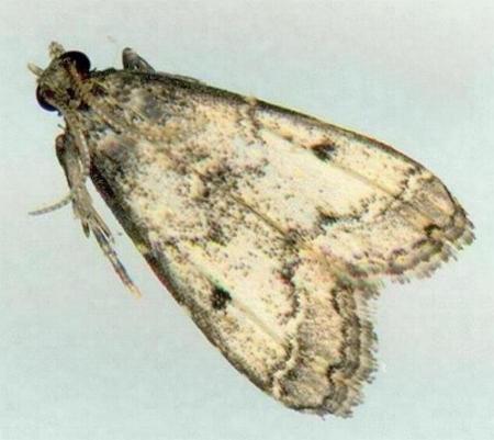 The adult moth of this species is pale brown, with some dark-edged pale zigzag lines on each wing. The forewings also often each have a central dark spot. The moth has a wingspan of about 1.5 cms.