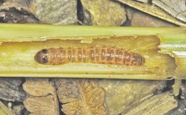 The adult moths are pale brown with dark spots and zig-zag lines on the wings. The wingspan is about 3 cms.
