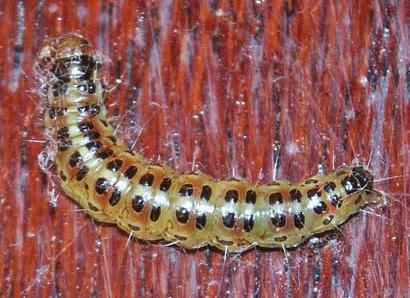 The caterpillars of this species are yellow, with a brown head, black thorax, black tail, and pairs of black spots along the back.