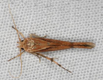 The forewings of the adult moths are brown with a white-edged diagonal black line along half the wing from base to hind margin, and pair of spots, one black, one off-white, by the wingtip. The hindwings are plain pale brown. The wingspan is about 1.5 cms.