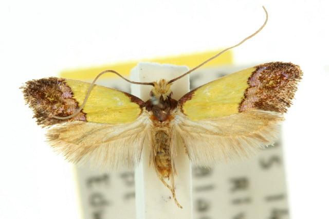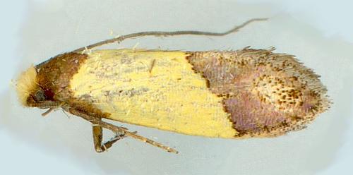 The adult moth of this species has yellow forewings, each with a dark brown base, and a broad brown margin containing a small yellow patch. The hindwings are plain brown. The head has a tuft of yellow hair. The moth has a wingspan of about 1.5 cms.