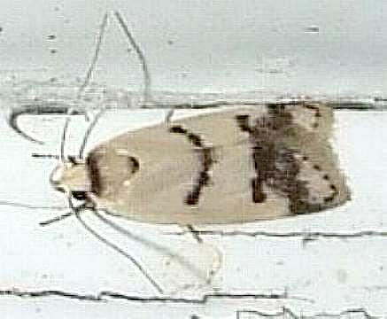 The adult moth has white forewings, each with a broken dark brown line across the middle, and a ragged dark brown submarginal band. The hindwings are white shading to brown at the margins. The wingspan is about 2 cms.