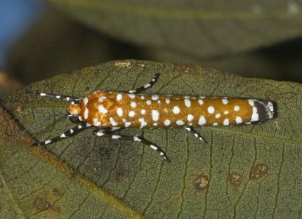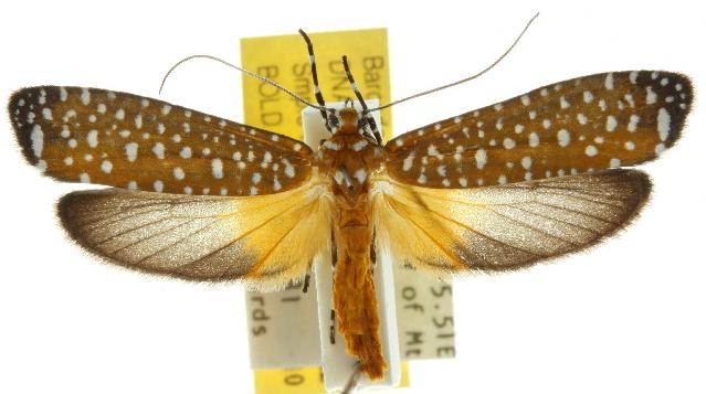 This adult moth has dark orange forewings with white spots. The hindwings are yellow, shading to dark brown at the wingtips. Its wingspan is about 2.5 cms.