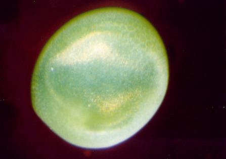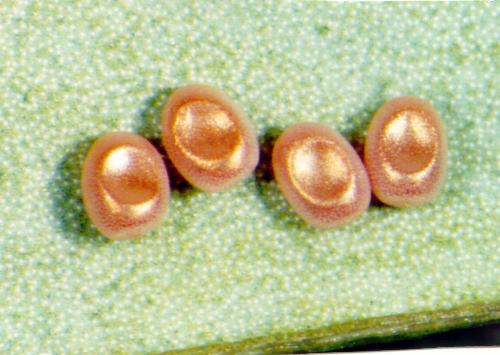 The eggs are initially pale green, smooth, and ellipsoidal, with a large dimple. They each have a length of about 0.7 mm. They are laid singly and randomly (not in a row: they were arranged like that for the photo). As they approach hatching, they become brown.