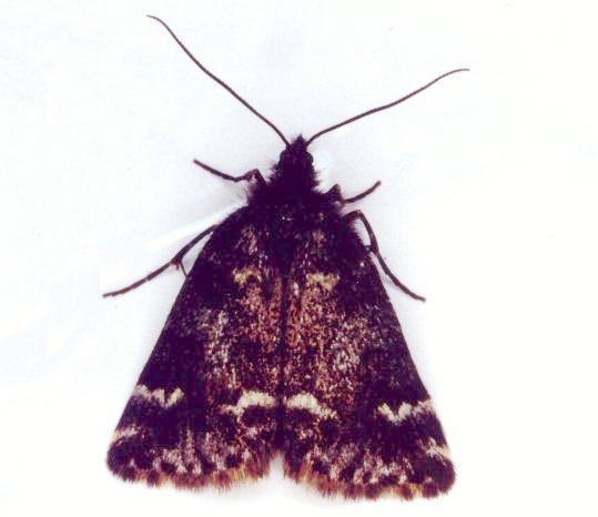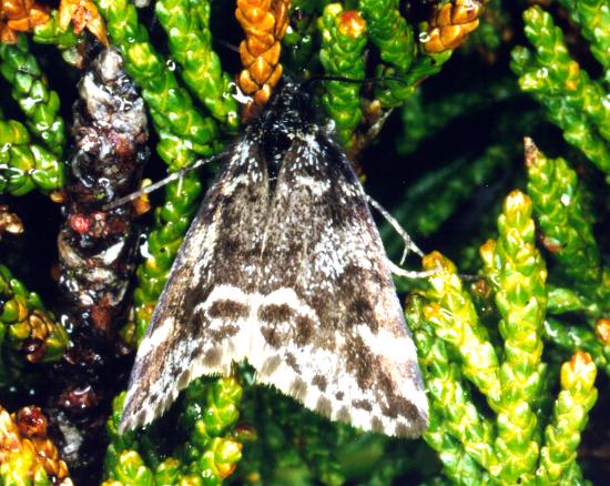 The adult moths have dark brown forewings with white markings. The wingspan is about 4 cms. The adults fly in late autumn on sunny days, braving the often very cold conditions at high altitude at that time of the year. The moth has only been collected from Mt Field in Tasmania at about 1000 metres altitude.