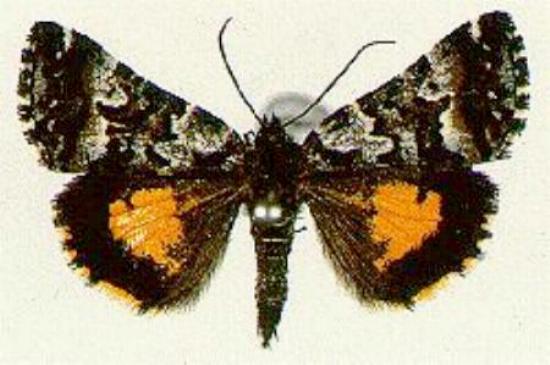 The adult moths are very handsome, with a striking black and grey pattern on the forewings, and orange hindwings with a black border. The wingspan is about 3 cms.