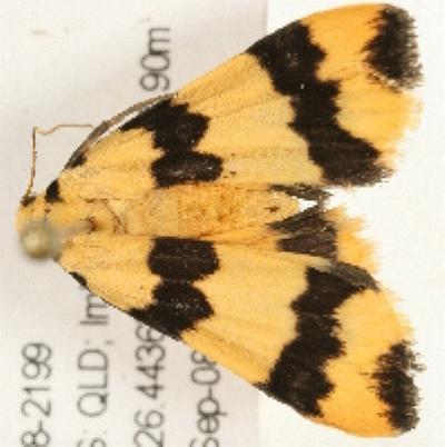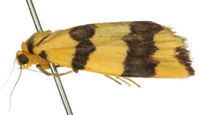 The adult moth of this species has yellow forewings, each with two black zig-zag transverse lines, a black splodge on the margin near the wing-tip, and a black spot at the base of the costa. The hindwings are yellow with a black band along each margin. It has a wingspan of about 3 cms.