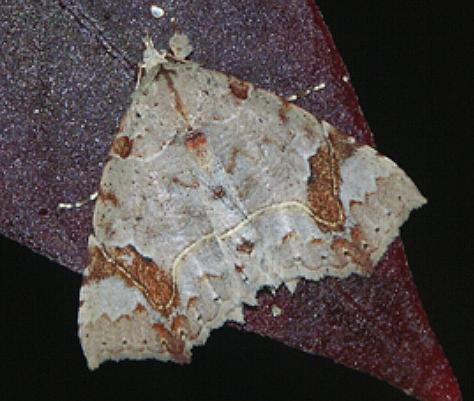 The adult moth of this species has greyish-brown wings, with a variety of variable rusty-brown areas on each forewing. Each forewing costa is curved back so that the wingtip is hooked. The forewing margins are scalloped, and there is a cusp halfway along each forewing margin. The wingspan is about 4 cms.