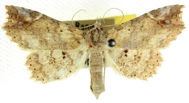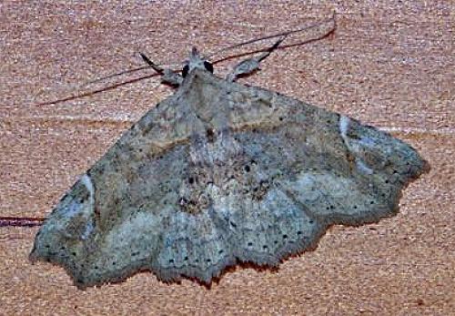 The adult moth of this species has grey patterned wings, with a white tick on the costa of each forewing. Each forewing costa is curved back so that the wingtip is hooked. The forewing margins are scalloped.