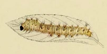 Early instars are off-white and hairy. As the caterpillar matures, it loses the hairs and becomes smooth. The mature caterpillars are buff coloured, with a horn on the tail and brown marks on the thorax. The caterpillars grow to a length of about 4 cms.